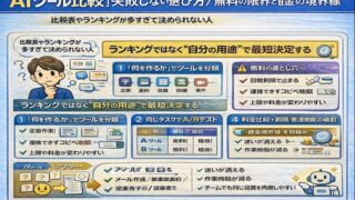 比較 【AIツール比較】失敗しない選び方!無料の限界と課金の境界線! 「AI ツール 比較」で迷う人向けに、生成AIツール一覧を用途別に整理。比較表で品質・料金比較・無料枠・性能ランキング・連携/安全性まで横並びし、最短で選ぶ手順を解説します。 2026.01.24 比較