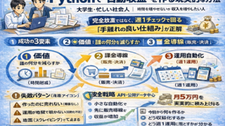 Python 自動収益を「不労所得」ではなく、週1チェックで回る“手離れの良い副業”として解説。稼げない原因の潰し方、月5万を狙うMVP手順、定期レポート/監視SaaS/ツール販売の具体例、スクレイピングのリスクとBAN回避、課金導線・ログ/監視・コスト上限までまとめます。今日から何を作るかが分かる。