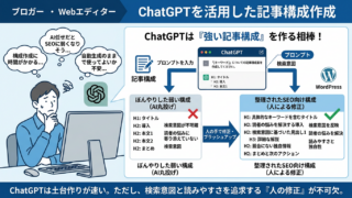 ChatGPTで記事構成を作る方法を、プロンプト設計・SEO・検索意図・人の最終調整までわかりやすく解説。読まれる見出しの作り方、失敗しないコツ、ブログ自動生成の注意点、WordPress入稿まで詳しくまとめています。