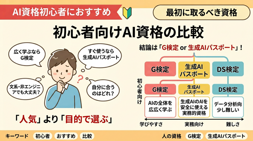 理由は、受験資格がなく、AI全体の基礎を広く学べて、合格率も比較的高く、文系や初学者向けの学習支援も見つけやすいからです。