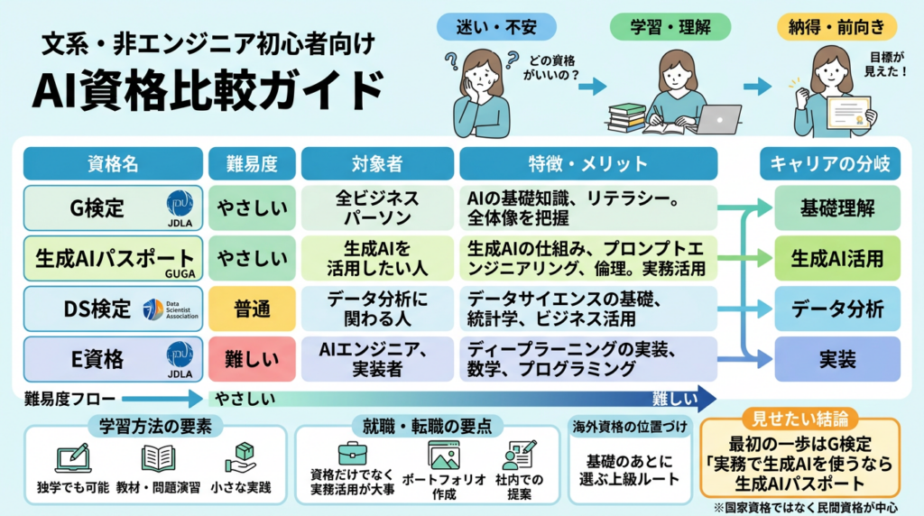 AI資格の初心者は、いきなりむずかしい資格に行くより、まず基礎理解型から始めるのがよいです。