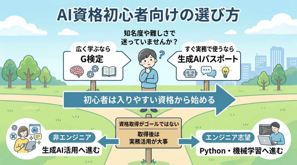 だから、最初の一歩はG検定が本命で、生成AIの実務を急ぐなら生成AIパスポートを補助線として考える、これが初心者にはいちばん分かりやすい選び方です。