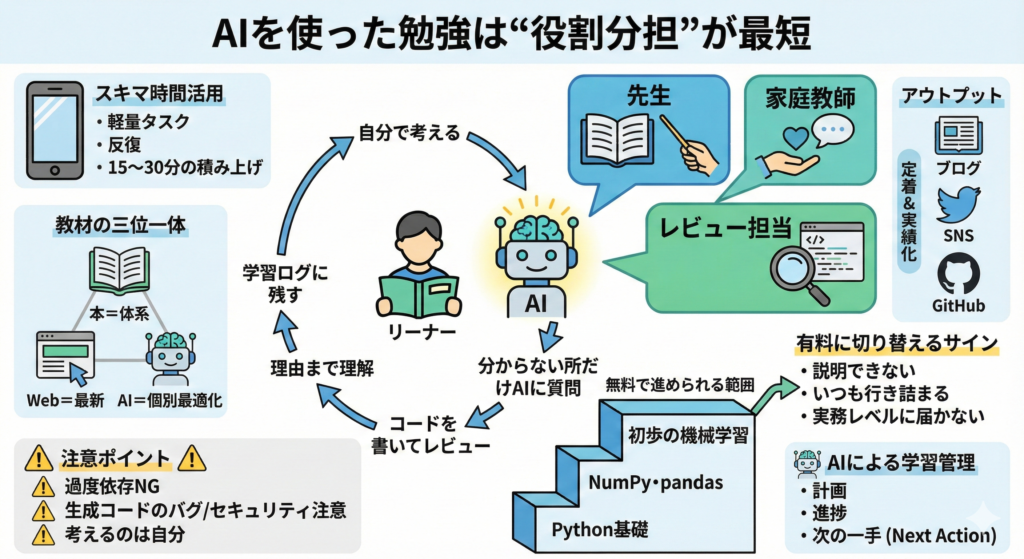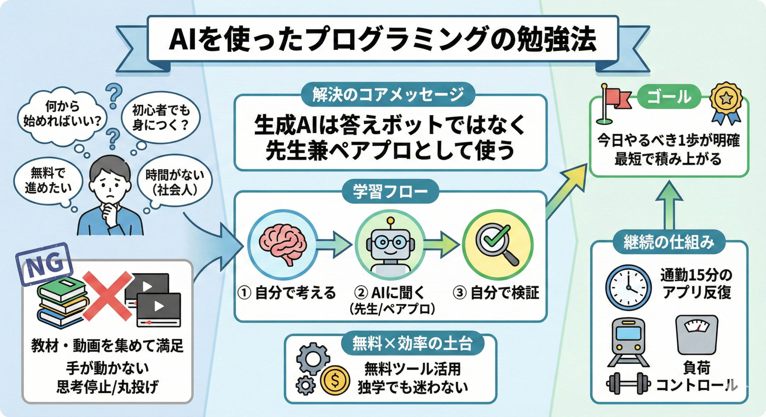 - 生成AI勉強方法とAIプログラミング学習をどう組み合わせれば、最短で伸びて「丸投げの失敗」を避けられるか