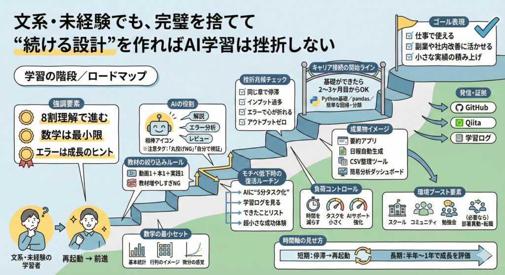 このように、文系か理系かではなく、「少しずつステップを分けて学ぶかどうか」が、AI勉強の続けやすさを決めるポイントになります。