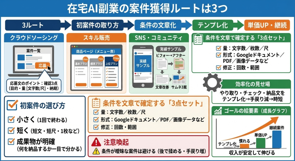 - 最短で稼ぐ鍵は「成果物が明確な仕事」から入る(文章/台本/サムネ/要約/資料)