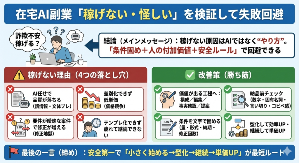 一方で、在宅副業は「怪しい案件」を踏むと崩れます。前払い・条件不明・修正無制限・虚偽レビュー・転載は避け、機密や個人情報はAIに入れず、取引条件(納品物の定義/形式/修正回数/報酬/支払日)は必ず文章で固める。これを守るほど、未経験でも“丁寧で安全に任せられる人”として選ばれやすくなります。