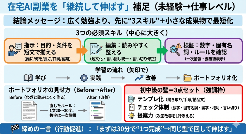 最初の目標は「速さ」より「正確さ」と「分かりやすさ」です。AIの出力は便利ですが、最後に人がチェックして直すことが信頼につながります。安全面(情報漏えい、著作権、事実確認)を守りながら、小さく始めて、直し方を覚えて、少しずつ得意分野を広げていくのが、在宅で続くAI副業のいちばん堅い進め方です。