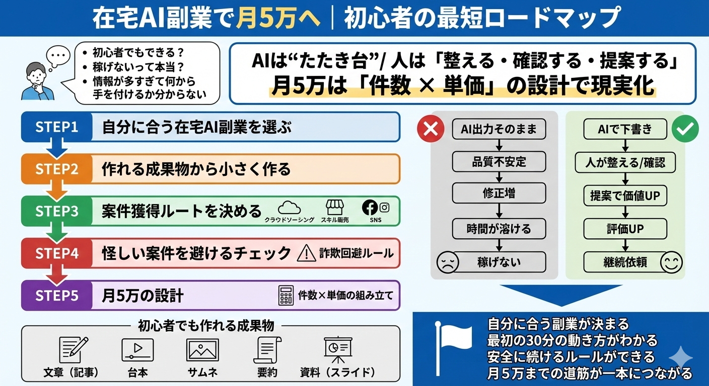 - 月5万は「週の作業時間」から逆算して件数×単価を組む(無理な高単価狙いは崩れやすい)