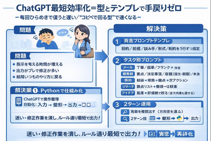 たとえば以前は、会議後の議事録作成や返信メールに毎回30分以上かかっていたのに、テンプレに「不足情報は最初に質問」「出力形式を固定」を入れたら、迷いが減って“ほぼコピペで完成”するようになった。次にPython 業務効率化を組み合わせて、入力→整形→出力を小さく自動化したら、毎週の定型作業がさらに短縮できた——。本記事は、そんな「型で回して速くなる」再現性を作るためのガイドです。