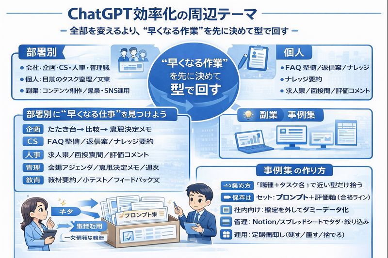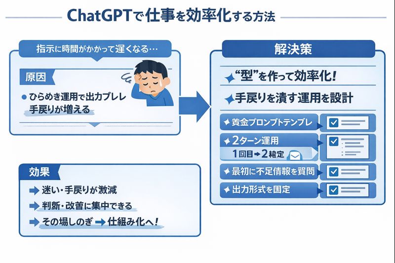 原因はシンプルで、ChatGPTは“ひらめき”で使うほどブレやすく、成果が安定しません。最短で効率化するには、コピペで回る「型」と、手戻りを潰す運用を先に作ることです。