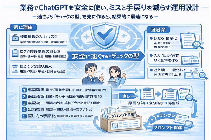 業務では、機密・個人情報を入れない抽象化、事実確認(数字・固有名詞・引用の裏取り)、表記統一、結論→根拠→論点→次アクションでの監査を標準化し、速さと安全を両立させましょう。